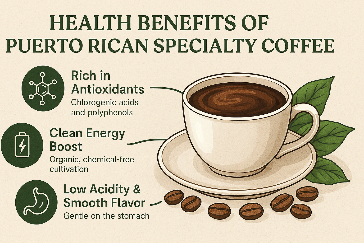 Specialty coffee from Puerto Rico is packed with chlorogenic acids (CGAs) and polyphenols, which combat oxidative stress and inflammation. It supports heart health and may reduce the risk of certain cancers.